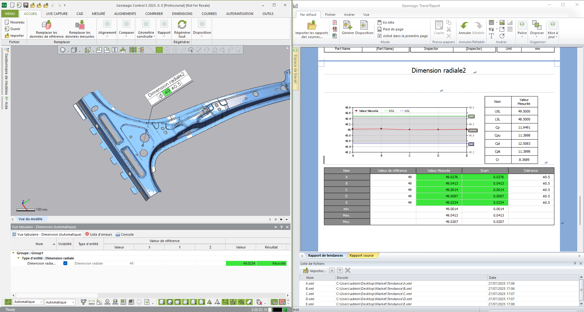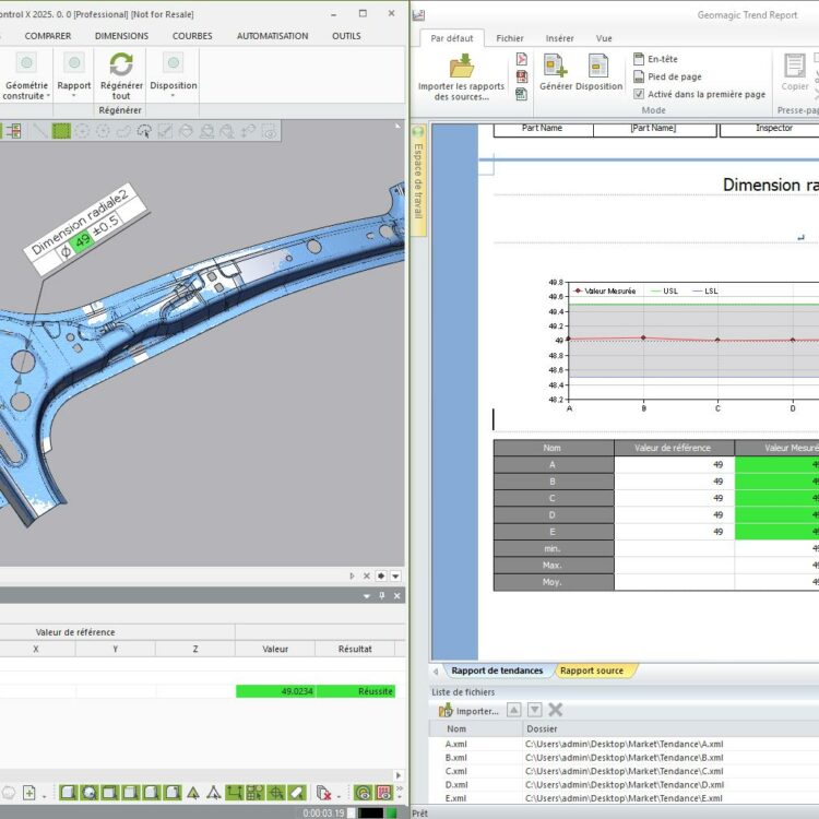Le suivi de tendance est une fonctionnalité clé pour transformer vos mesures 3D en indicateurs qualité à haute valeur ajoutée. En analysant l’évolution de vos cotes critiques sur plusieurs pièces, il devient possible d’anticiper un dépassement de tolérance, de valider une dérive maîtrisée, ou de déclencher une action préventive avant que la pièce ne soit non conforme.
